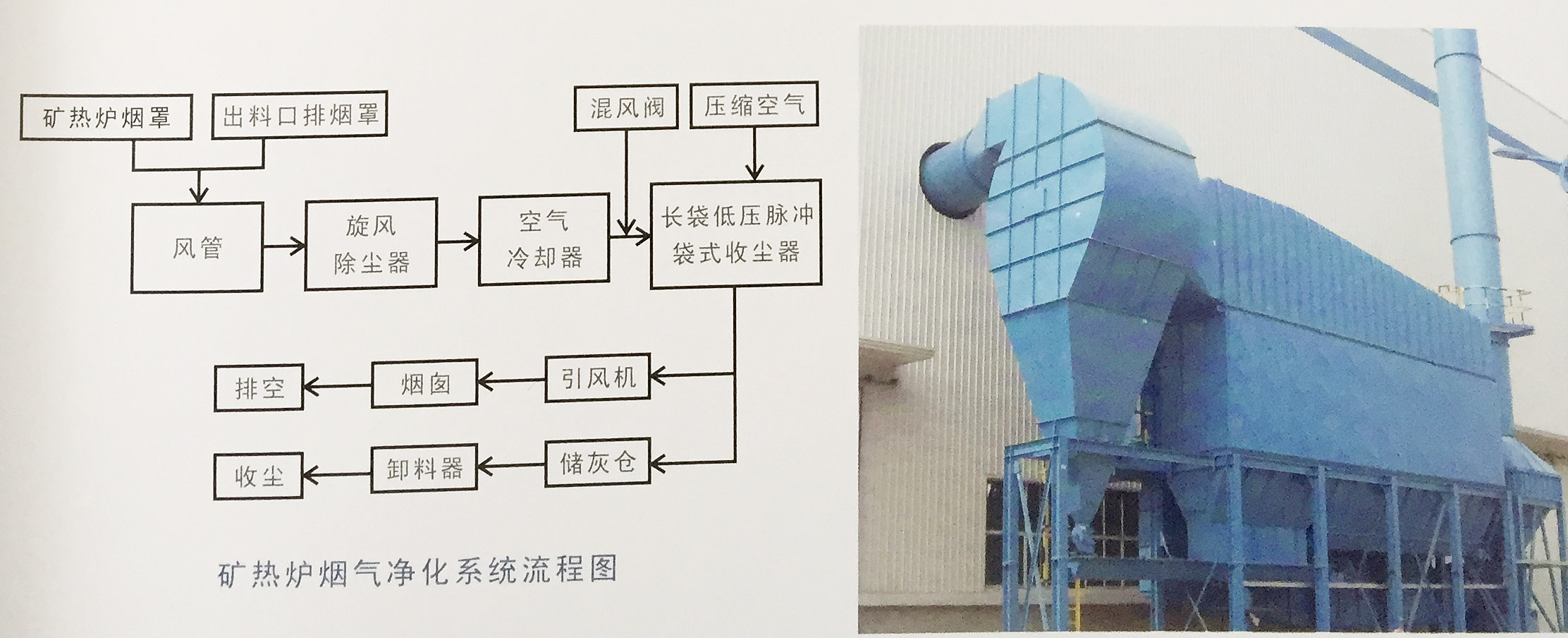 我公司经过长时间对矿热炉、硅铁炉袋式除尘技术的经验积累,在分析总结低压 长袋脉冲除尘器在矿热炉除尘系统中的使用经验和特点研发了矿热炉、硅铁炉、电石 炉专用分室离线脉冲清灰技可以达到要求的排放标准,并且可以节省用户 的投资和运行费用,负压大布袋除尘器成功应用于矿热炉、硅铁炉、电石炉除尘,使 矿热炉除尘技术又提高了一个台铁炉、电石炉烟尘成分复杂,粒径分布范围广, 且浓度高,细粉量大;同时烟气具肴緝度高、湿含量低的特点。这些特点导致了电石 炉粉尘比电阻总体偏高,各种不同化学成分的粉尘比电阻差异较大。采用袋式除尘器 系统治理电石炉、矿热炉、硅铁炉的烟尘,是目前电 石炉、矿热炉、硅铁炉除尘发展主流,由于电石炉 是高耗能生产设备,烟气中残留的热量多,烟气温度高,因此,不管采取何种的布袋除尘器系统,均须采取降温措施。电石炉、矿硅铁炉烟气首先 进分离大颗粒尘,再进入空气冷却器,风冷却器充分冷却、降温到袋除尘器能够承受的温 度范围,进入布袋脉冲除尘器,除尘后的烟气从引风 机烟囱达标排放,粉尘从灰斗排出。